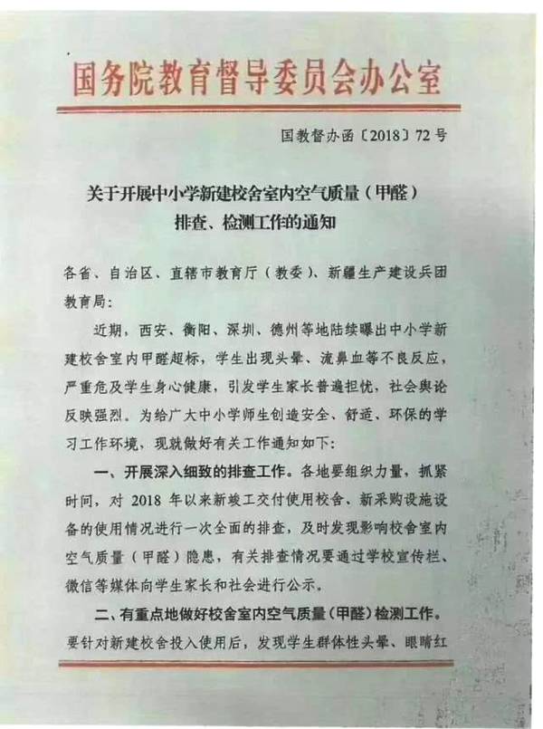 在今年九月份開學(xué)期間,西安、衡陽、深圳、德州等地陸續(xù)曝出中小學(xué)新建校舍室內(nèi)甲醛超標,學(xué)生出現(xiàn)頭暈、流鼻血等不良反應(yīng),嚴重危及學(xué)生身心健康,引發(fā)學(xué)生家長普遍擔(dān)憂,社會輿論反映強烈。為給廣大中小學(xué)師生創(chuàng)造、舒適、的學(xué)習(xí)工作環(huán)境,2018年9月21日,國務(wù)院教育督導(dǎo)委員辦公室發(fā)布了《關(guān)于開展中小學(xué)新建校舍室內(nèi)空氣質(zhì)量(甲醛)排...