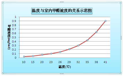 據(jù)日本科學(xué)家測(cè)算,溫度每升高1℃,室內(nèi)甲醛濃度增加12-13%。例如23℃時(shí),甲醛濃度是0.10毫克,30℃時(shí),甲醛濃度將達(dá)到0.22毫克,35℃時(shí),甲醛濃度將達(dá)到0.41毫克。溫度與甲醛濃度的示意圖如下: